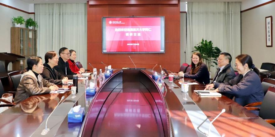 11月27日,南昌航空大学校史研究中心主任邓瑾、文法学院党委书记陈钧一行4人到档案馆调研交流。档案馆馆长、校史党史办主任汤涛,副馆长林雨平、现代技术(办公)室主任胡琨接待来访。