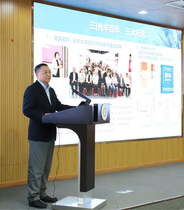 档案馆馆长、校史党史办主任汤涛首先作档案与校史党史工作报告与动员讲话。汤涛强调了档案校史党史工作的愿景目标,提出了“档案为体,校史为用。传知播识,体用贯通”的工作方法,全面回顾了2025年学校档案校史的工作情况,主要包括承担光华百年重点活动,传承百年历史文脉;推出档案校史编研新成果,提升学校文化自信;持续征集特色档案,建设名人档案库等;推进智慧档案馆建设,服务全球50余万师生校友;对口支援中国高校抗战迁徙纪念陈列馆建设;借力地方资源,校地联建校友名人馆,提升师大美誉度等。