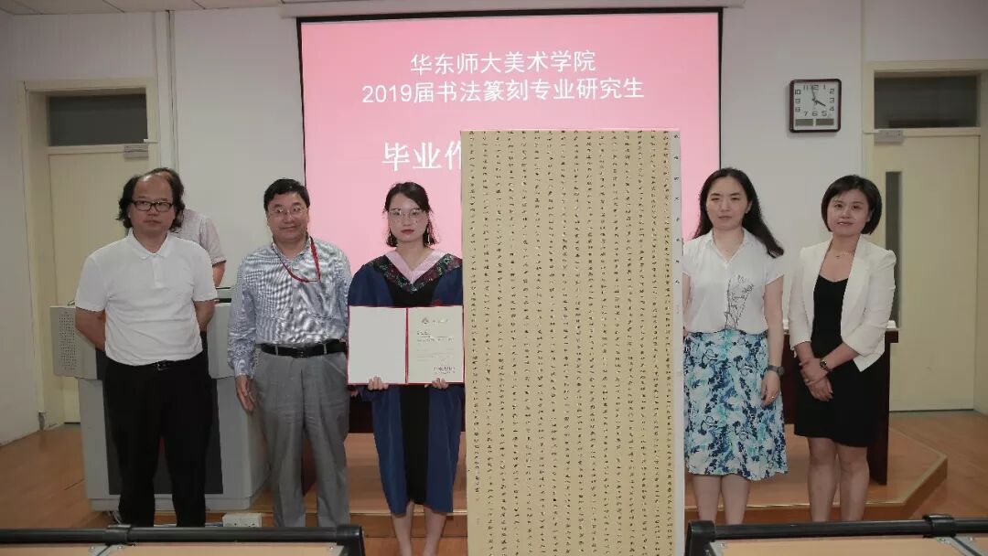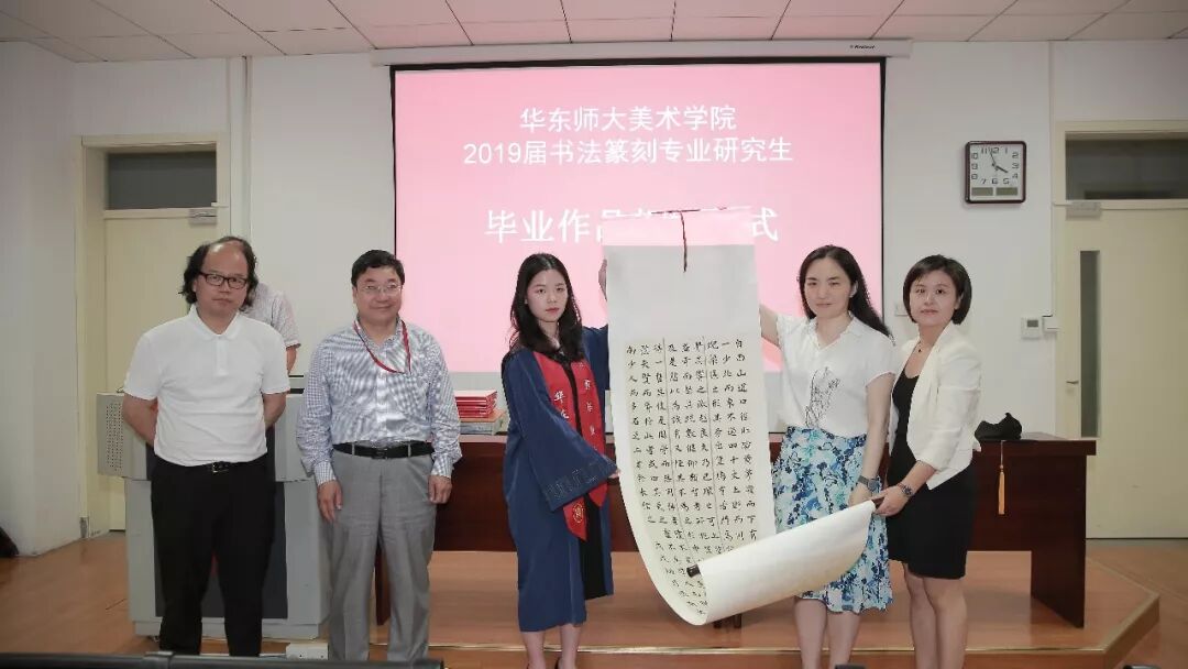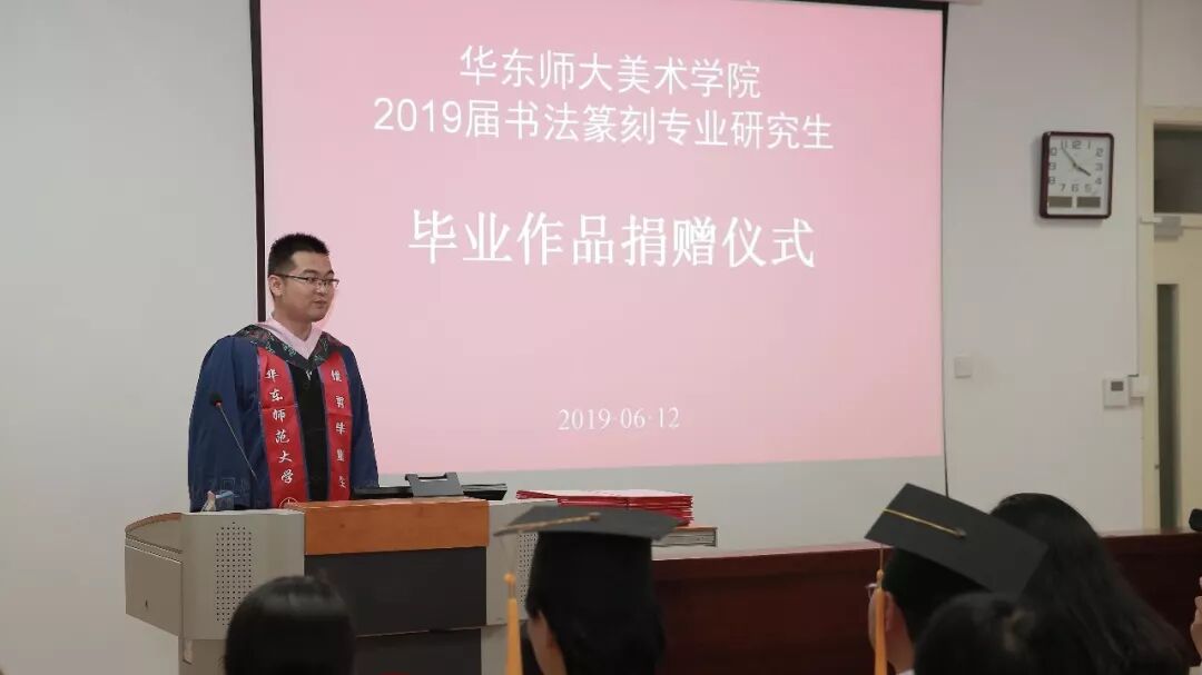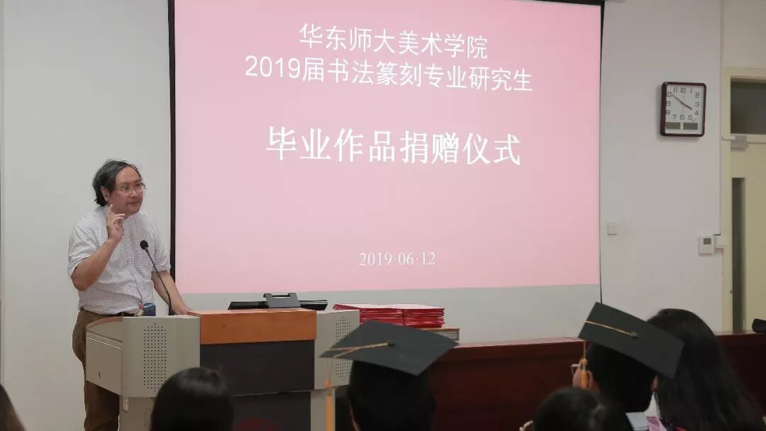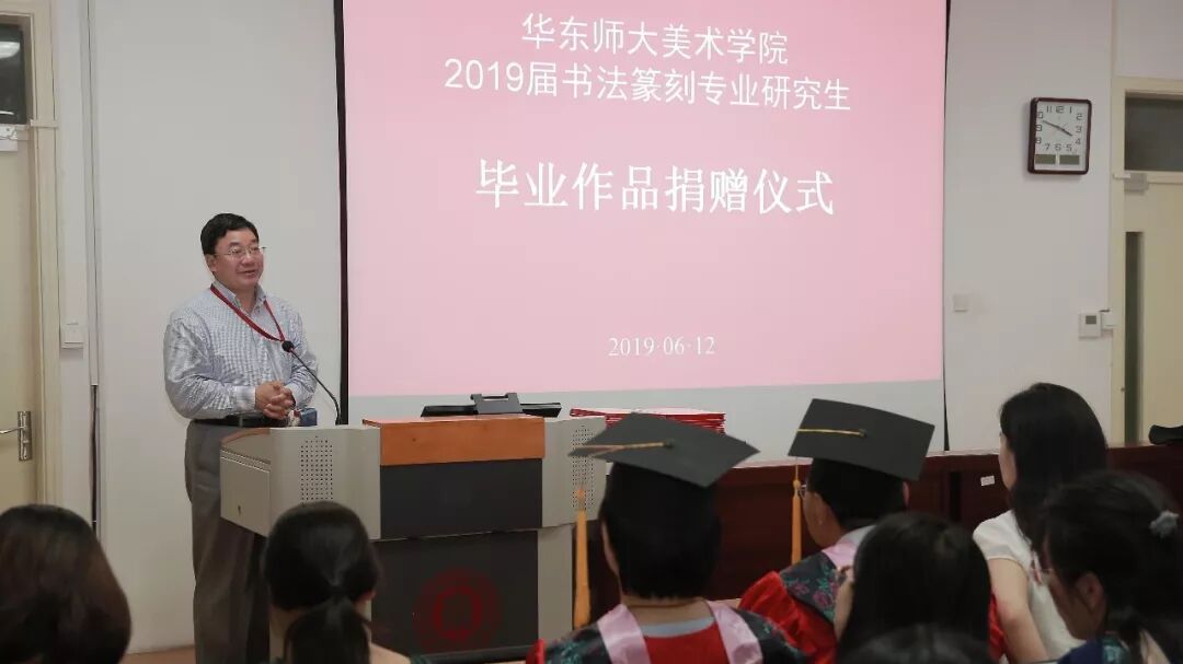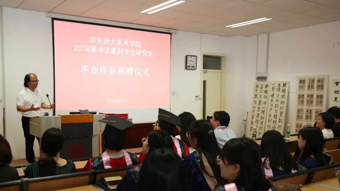 2019届书法篆刻专业研究生毕业作品捐赠仪式于6月12日下午三点在华东师范大学美术学院举行,校史党史办公室主任兼档案馆副馆长施家仓,档案馆副馆长李炜菁,美术学院院长张晓凌,院党委副书记刘麒,副院长郑文,中国画与书法系主任蔡广斌,副主任张索,书法篆刻专业导师顾琴、崔树强,辅导员宼思、周蔚蔚等50余人出席。捐赠仪式由张索主持。
